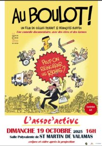 L’ASSOC’ACTIVE organise un ciné-goûter crêpes , dimanche 19 octobre à la salle polyvalente de Saint Martin de Valamas à 16H avec la projection du film « au Boulot » de Gilles Perret et François Ruffin