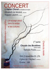 Et en première partie se produira le grand chœur de la chorale des Boutières, sous la direction de Nathalie Pardo ,
