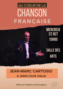 La Mairie de Saint-Agrève vous invite à un concert de chanson française par Jean-Marc Cartosio au chant et Jean-Louis Valle au piano mercredi 22 octobre à 15h à la salle des Arts de Saint-Agrève.