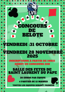 Le club de Basket de La Voulte Sur Rhône organisera deux concours de belote vendredi 28 novembre 2025 à la salle des fêtes de Saint Laurent du Pape, inscription à partir de 19h15, début des concours à 20h.