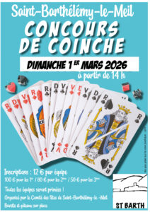 Le Comité des fêtes de Saint-Barthélémy-le-Meil vous invite à son concours de coinche, le dimanche 1ᵉʳ mars 2026, à partir de 14 heures à la salle des fêtes du village.