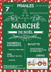 Pranles animations organise un marché de Noël le dimanche 7 Décembre de 10 à 17h à Pranles. Avec des nombreux exposants, buvette, vente de pain et de caillettes cuites au four à bois, crêpes, Noël au bout du fil; calèche pour les enfants et visite du père Noël.
