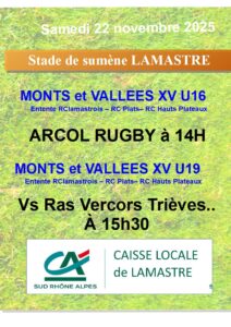 Rugby lamastrois : l’entente Monts et vallées xv, qui regroupe les clubs de Lamastre, Plats et les hauts plateaux, joue à Lamastre le samedi 22 novembre.