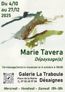 Et le 5 décembre avant la lecture pleine lune de Marie TAVERA à la bibliothèque qui aura lieu donc à 18: 30 , vous pourrez aller voir sa magnifique exposition à la galerie la traboule, à Desaignes ! Francine et Xavier seront ravies de vous accueillir de 15h à 18h , soyez curieuxses on a de la chance d’avoir toutes ses propositions à Desaignes !! À bientôt