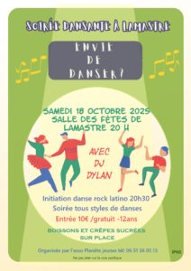 L’association de danse planète jeunes organise une soirée dansante samedi 18 octobre dès 20h à la salle polyvalente de Lamastre.