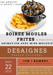 Le comité des fêtes de Désaignes organise une soirée moules frites le samedi 22 novembre 2025 à l’espace culturel de Désaignes à partir de 19h.