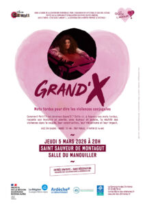 La Compagnie des Chimères vous propose le spectacle « Grand’X », mots tordus pour dire les violences conjugales, mardi 3 mars 2026 à 20h à Beauchastel et jeudi 5 mars 2026 à 20h à Saint Sauveur de Montagut.