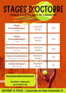 Stage tennis à Lamastre , lundi 27 octobre stage tennis-multisports de 10H à 13H pour les 11/14 ans ou de 14H à 17H pour les 6/9ans